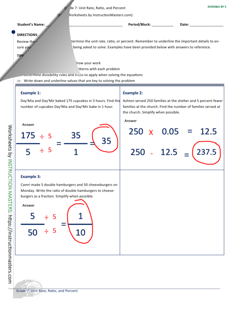 INCLUDES: Access to download unit rate worksheet that contains a combination of beginner, intermediate, and advanced math problems divisible by 2, specifically related to unit rate for students in grades 7 and 8. The PDF file is formatted for use in Adobe. This batch focuses on numbers divisible by 2. Other worksheets are available via our digital products page via https://instructionmasters.com